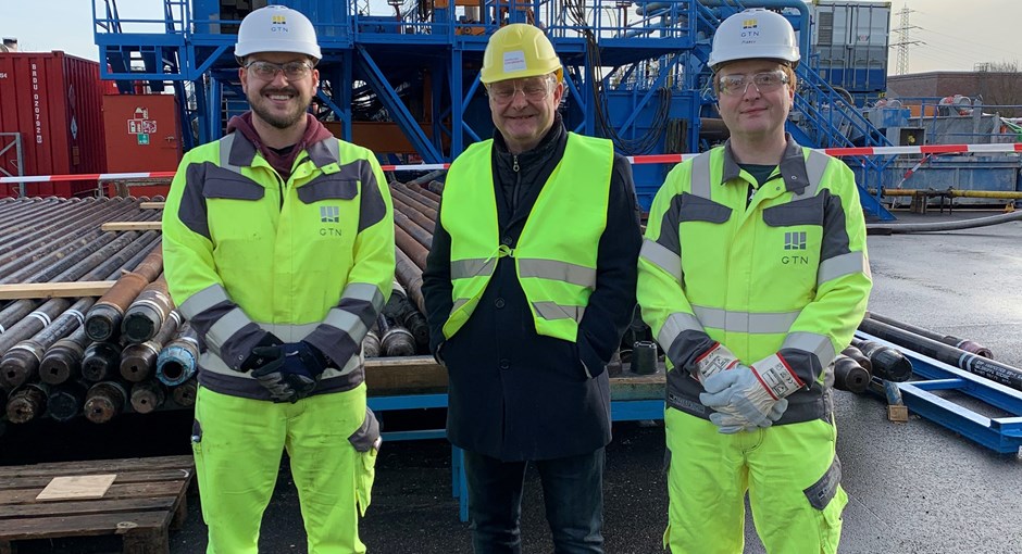 In this picture <FLTR> construction supervisor Paul Wager (GTN), Senator of Hamburg for Environment, Climate, Energy and Agriculture Jens Kerstan and the responsible geologist Dr. Marco Wunsch (GTN)